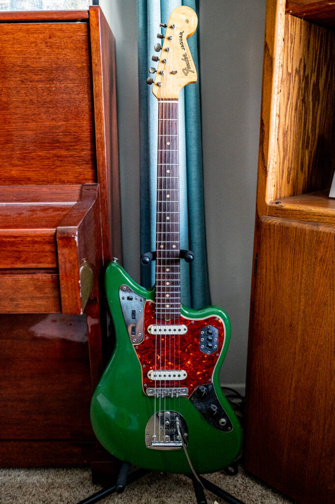Pride and joy. 1963 Pre-CBS Leo-Era Fender Jaguar, all original except for a body refinish that I meant to change but somehow fell in love with the weird green and red Christmas in a 1960’s surf movie vibe. This one even has the flat pole pickups, which were an accidental feature in these that sounded better than the staggered pole ones. (Has nothing to do with being flat or staggered, but with the fact that they just happened to wind the flat pole ones differently.) I absolutely love Jaguar’s. Many people are unaware that the Jaguar was actually Leo’s last invention at Fender, he considered it his final mastery of guitar design at the time, and it was Fender’s highest priced retail guitar. They of course didn’t sell as well as the Stratocaster or Telecaster, but at their birth they were the “jaguar” of guitars, outpricing everything else. The vibrato system alone is absolutely perfect, allowing for a solid guitar while still having full control of the vibrato, even dippier than a through body vibrato.
